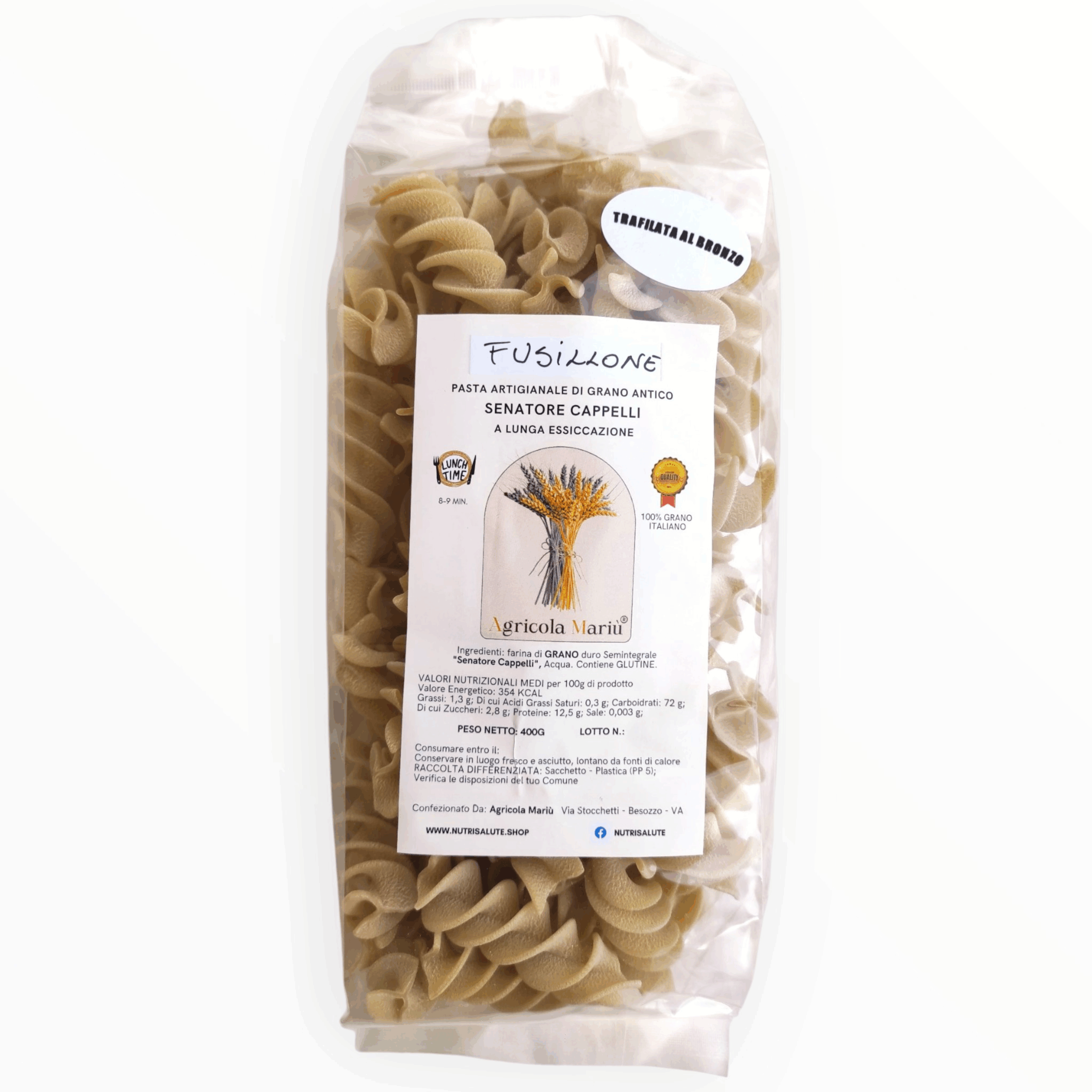 Pasta realizzata con semola di Grano duro Senatore Cappelli semintegrale, puro. La quantità di proteine presenti, per 100 grammi di prodotto è pari a 12,5 gr. Lavorazione con TRAFILA AL BRONZO che ne esalta la ruvidità per un formato che aggrappa molto bene sughi e condimenti in generale.